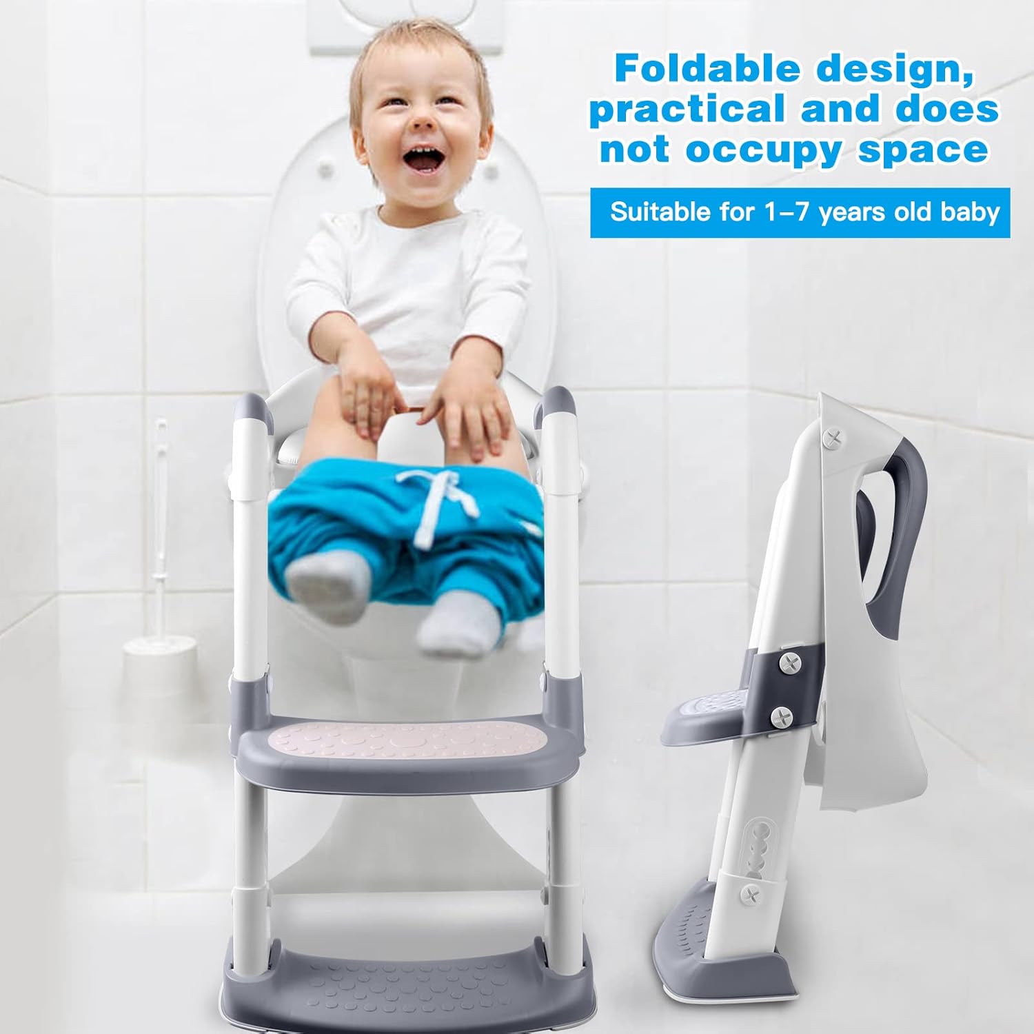 Diseño plegable que se guarda junto al inodoro en segundos. Ahorra espacio en baños pequeños y facilita llevar el asiento cuando se visita otra casa o viajamos con el niño.