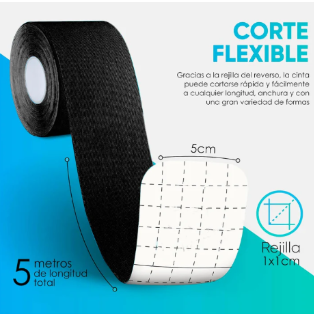 Cada rollo tiene 5 metros de largo por 5 centímetros de ancho, suficiente para múltiples aplicaciones en distintas zonas del cuerpo.