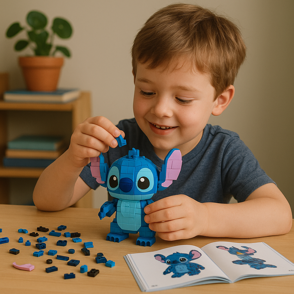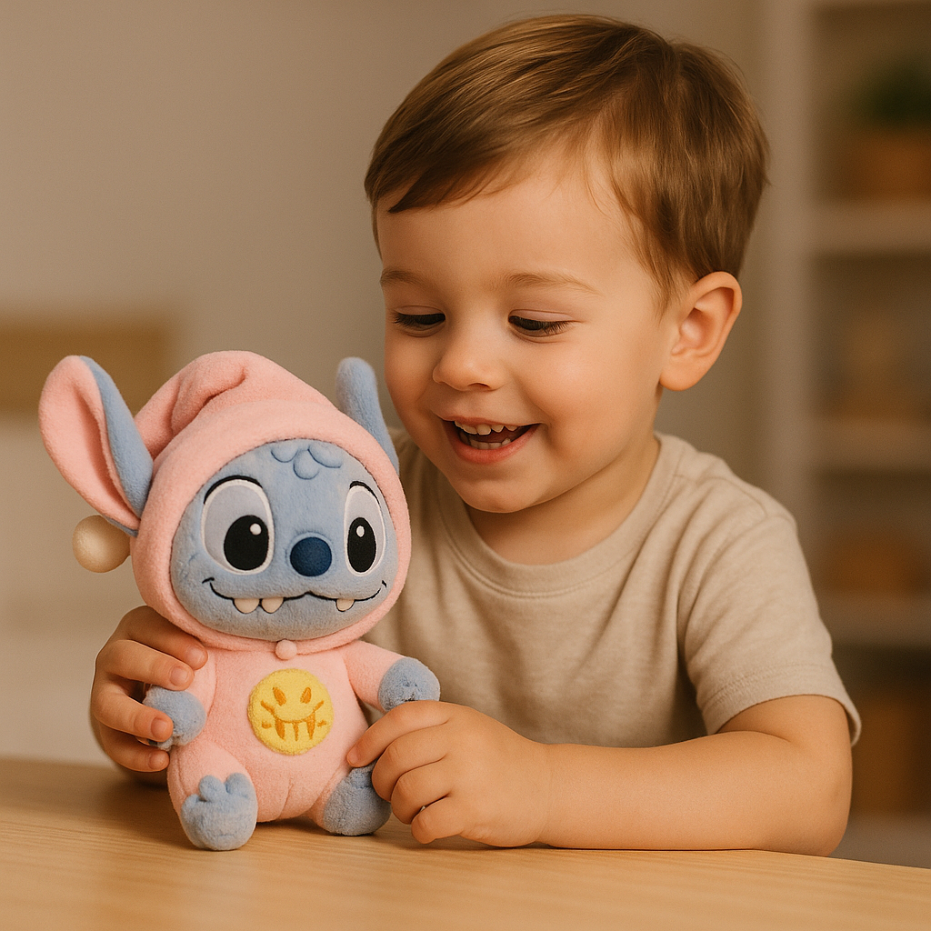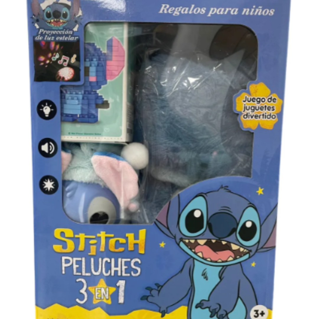 Incluye 1 peluche Stitch proyector de luces, 1 figura coleccionable estilo Labubu y 1 set armable estilo bloques. Todo llega junto en un solo paquete.