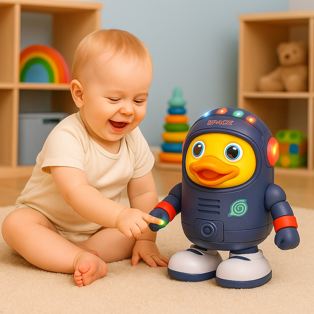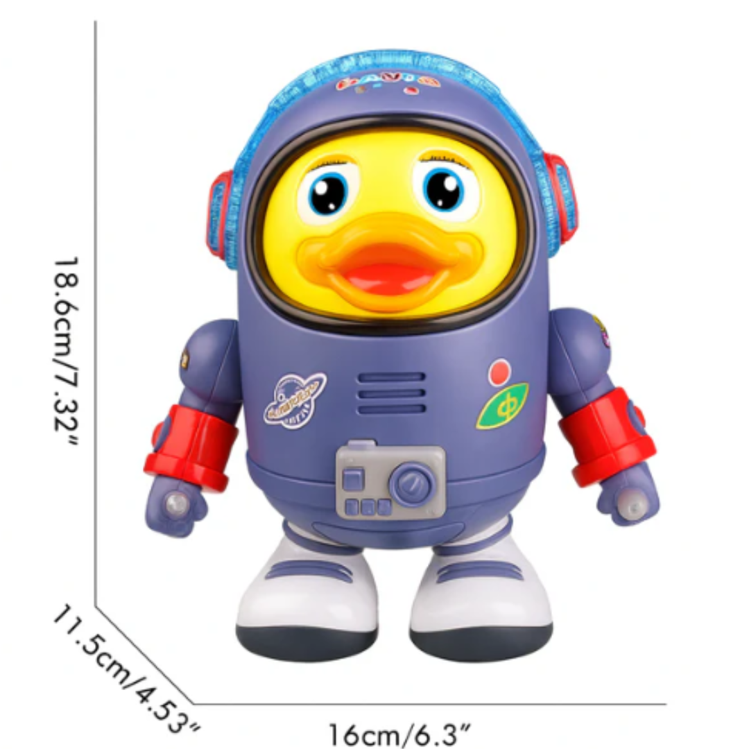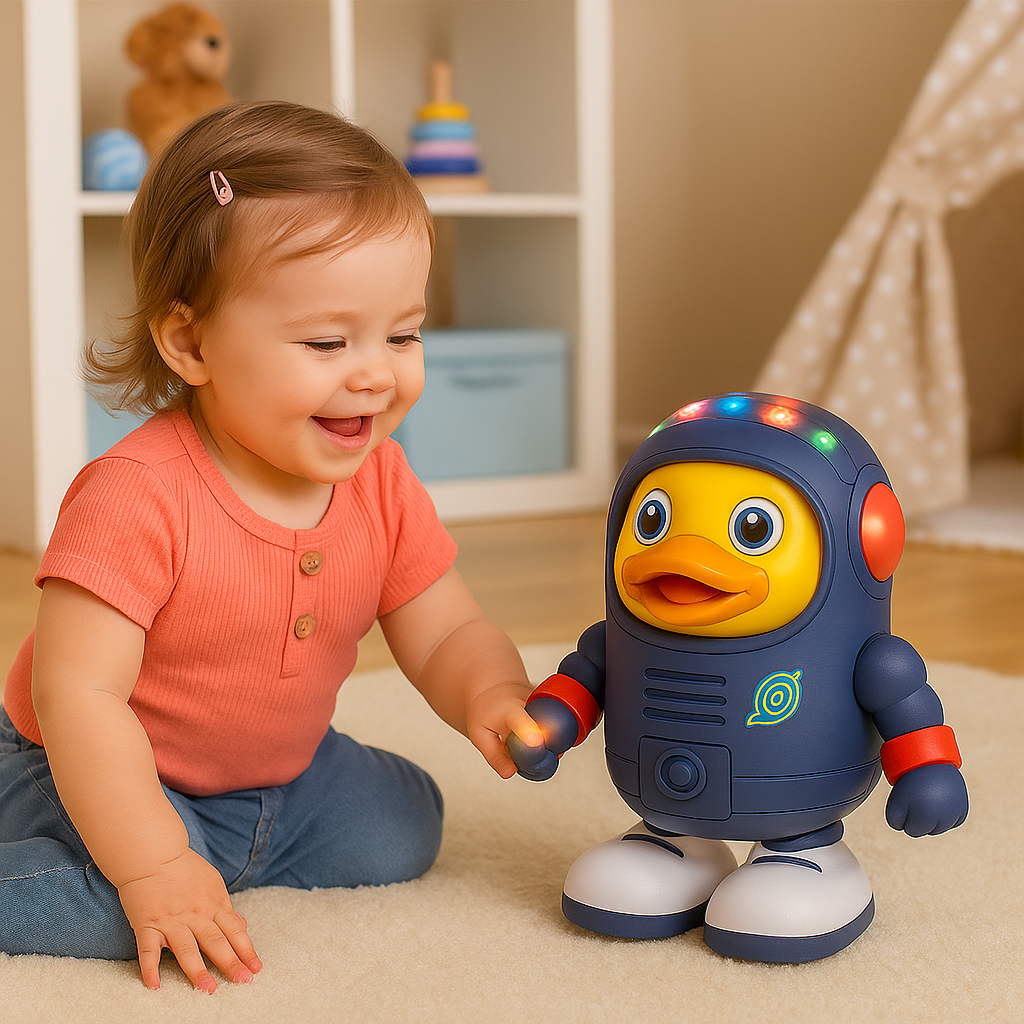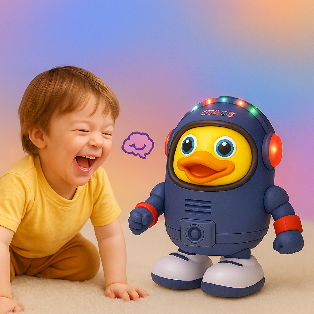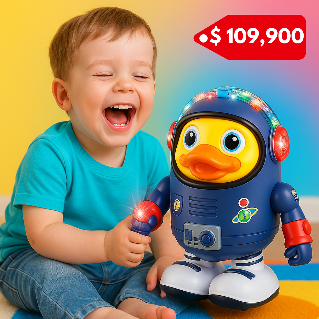 El Pato Bailarin camina, gira, baila y enciende luces LED al ritmo de la música. Estimula la coordinación, la audición y la memoria de los niños mientras se divierten sin pantallas.